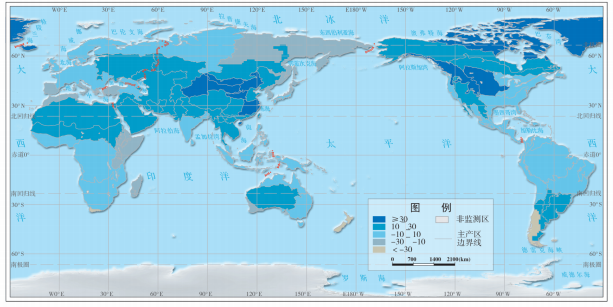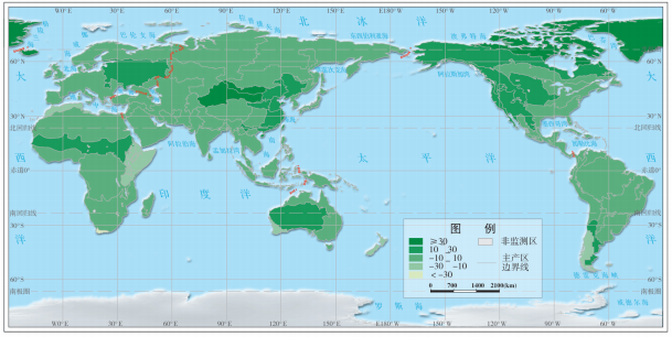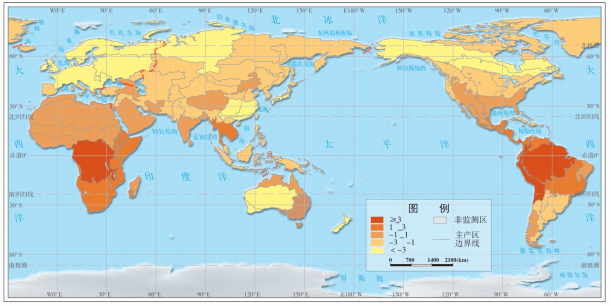降水较过去15年平均水平偏高的区域包含美国大平原、不列颠哥伦比亚至科罗拉多地区、美国西南部至墨西哥北部高地、南美潘帕斯草原,降水量分别偏高43%、32%、20%和12%;非洲萨赫勒向东延伸至中国东部的广大地区也是降水距平的高值区,包括西亚、中国甘新区、长江中下游地区、中国内蒙古至长城沿线区、黄土高原区、印度的旁遮普至古吉拉特邦、中南半岛地区,降水较过去15年同期平均水平分别偏高21%、139%、40%、67%、31%、27%和12%。伴随着降水的增加,其云盖增多,导致上述地区光合有效辐射较往年偏低(图2-2)。