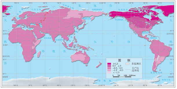 农业生态区是2016年年报全球农业气象条件分析的大尺度标准空间单元。本章基于全球65个农业生态区,重点分析农业环境指标异常的区域。每个农业气象指标都以农业生态区的作物种植区域为对象,统计2016年全年(2016年1月-12月)、北半球夏收和南半球秋收作物生育期(2015年10月-2016年6月)与北半球秋收和南半球夏收作物生育期(2016年4月-9月)的农业气象指标,并与2001至2015年同期平均值进行比较,计算每种指标在2016年的距平值。其中温度、降水和光合有效辐射是2016年与过去15年(2001-2015)的平均值对比,潜在累积生物量是2016年与过去5年(2011-2015)的平均值对比。