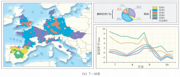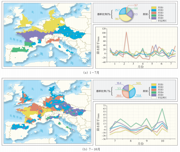 图3-17 欧洲西部主产区降水量距平聚类空间分布及相应的类别过程线