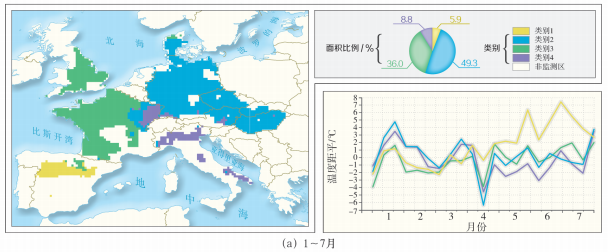 图3-18 欧洲西部主产区温度距平聚类空间分布及相应的类别过程线