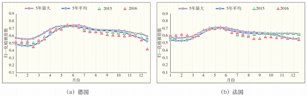 欧洲西部农业主产区全年农业气象条件总体略高于多年平均水平。全年降水量为717mm,较多年平均降水量偏低9%;平均气温为10.7℃,较多年平均气温偏低0.3℃;光合有效辐射较多年平均水平偏低4%。夏收作物生长季内(2015年10月至2016年6月),受适宜的温度与降水量处于正常水平的影响,潜在生物量偏高1%。秋收作物生长季内(4~9月),虽然较多年平均水平,温度偏高0.4℃,但受光合有效辐射偏低3%,降水量偏低8%的影响,潜在生物量偏低5%(表3-9)。