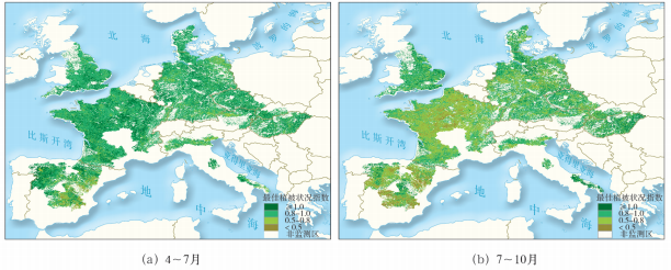 与过去15年平均水平相比,欧洲西部主产区年内降水量、平均气温聚类及类别过程线均反映出主产区内的农气条件时空分布差异较大(图3-17、图3-18)。其中,1~4月,除了1月上旬的奥地利、斯洛伐克、匈牙利的大部分地区与法国的东南部,2月下旬至3月中旬的法国、德国、捷克、奥地利、斯洛伐克、匈牙利与西班牙的大部分地区,以及1月下旬、2月下旬至4月下旬的意大利北部降水量低于往年平均水平外,欧洲西部主产区降水量总体比过去15年平均水平偏高12%;温度上升0.4℃,光合有效辐射总量偏低7%。较好的农业气象条件有利于夏收作物的生长与收秋作物的播种;德国与法国2015年的作物生长过程线(图3-19)也反映了该期间作物生长状况略好于平均水平。4~7月期间,欧洲西部主产区降水量总体比过去15年平均水平偏高5%,但在4月中旬至6月中旬的西班牙大部分区域、法国西南部地区以及4月意大利北部地区降水偏低,6月中旬除西班牙与法国西南部地区外,主产区大部分区域降水量均低于平均水平;温度略高于平均水平(偏高0.1℃),光合有效辐射总量偏低5%;在该监测期的前半段,充足的降水与适宜的温度条件有利于夏收作物的生长,但受6月中旬水分胁迫的影响,作物总体长势开始出现了下降趋势。7~10月期间,主产区降水量相比过去15年平均水平偏低25%,同时8月热浪横扫整个主产区,德国、法国、意大利、比利时、奥地利、瑞士等地经历了“烧烤模式”,尤其是7月至8月中旬期间西班牙部分地区温度逼近40℃,创下了历史最高纪录。降水短缺与高温不利于秋粮作物生长后期的发育与成熟;最佳植被状况指数为0.81(图3-20)。