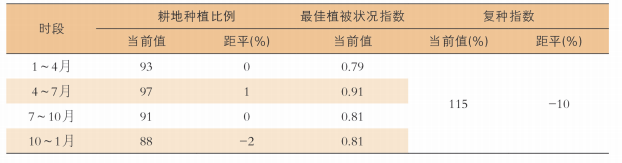 主产区主要种植冬小麦、冬大麦、夏玉米、甜菜等作物。受秋收作物播种期水分胁迫以及低于平均气温的影响(10月上旬),仅2016年10月至2017年1月期间耕地种植比例总体低于过去5年平均水平,未种植耕地达到主产区耕地面积的12%,该期间未种植耕地主要集中分布在意大利的东南部与西班牙境内,该区域主要种植的是夏收作物(大麦、小麦),5月底收获后直至10月底一直是休闲阶段;全年其他不同时间段监测结果显示,除4月至7月主产区耕地种植比例较过去5年平均水平偏高1%外,1~4月与7~10月期间的主产区耕地种植比例与过去5年平均水平持平(表3-10)。