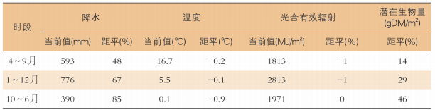 2016年,内蒙古及长城沿线区农业气象条件总体较好。与过去15年平均水平相比,全年降水量偏多67%,全年平均气温偏低0.1℃,光合有效辐射稍低于过去15年平均水平,为农作物生长提供了充足的水分和温度条件,潜在生物量偏高29%(表4-6)。但是降水区域内分布不均衡,导致内蒙古东部和东北部、宁夏中部、陕西北部等地区农作物生长受到水分胁迫,发生旱情。