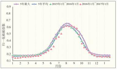 图4-13 内蒙古及长城沿线区作物生长过程线(2016年1月~2017年1月)