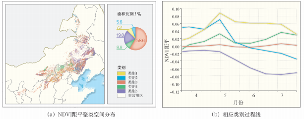 图4-14 2016年4~7月内蒙古及长城沿线区NDVI距平聚类空间分布(a)及相应的类别过程线(b)