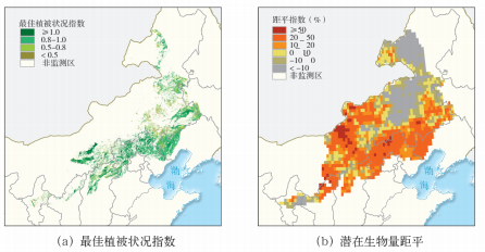 图4-15 2016年4~7月内蒙古及长城沿线区最佳植被状况指数(a)及潜在生物量距平(b)