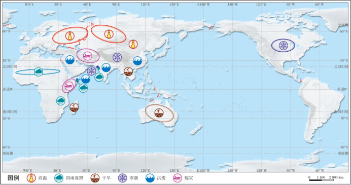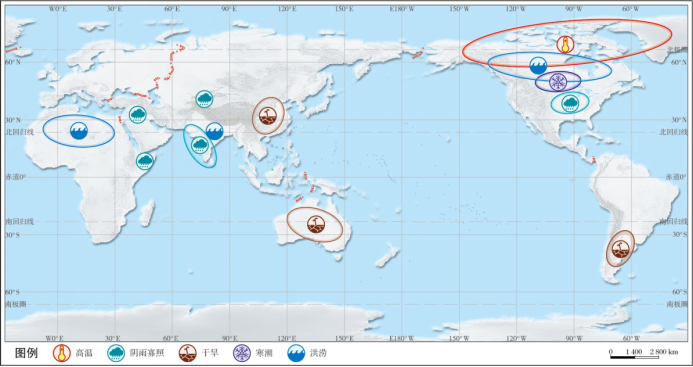 图2-2 2019年10月—2020年6月期间全球极端气候事件分布示意图