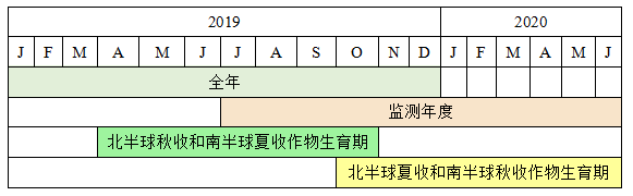 全球65个农业生态区是本报告农气状况分析的基本空间单元,对农业环境指标变化明显异常的区域及其潜在影响进行重点分析。表2-1列出了本报告的农气条件监测时段,分别对应 2019年全年、监测年度(2019年7月—2020年6月)、北半球秋收和南半球夏收作物生育期(2019年4—10月)和北半球夏收和南半球秋收作物生育期(2019年10月—2020年6月)。每个农业气象指标只针对农业生态区的耕地区域,统计2019年全年、监测年度、北半球秋收和南半球夏收作物生育期、北半球夏收和南半球秋收作物生育期的平均气温、累积降水、光合有效辐射和潜在生物量等农业气象指标的区域平均值,并与过去15年同期的平均值进行对比,作为每种指标在2019—2020年的偏离正常状况的幅度。