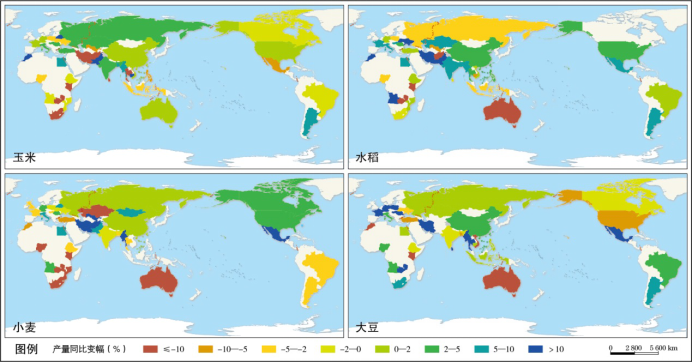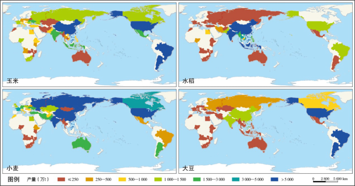 2019年全球玉米产量为10.55亿t(增幅0.5%),水稻产量为7.54亿t(增幅4.2%),小麦产量为7.16亿t(增幅0.9%),大豆产量为3.24亿t(减幅1.0%)。43个主产国共贡献了9.65亿t玉米(增幅0.9%)、6.78亿t水稻(增幅4.6%)、6.44亿t小麦(增幅0.9%)和2.94亿t大豆(减幅0.8%)(图3-1)。