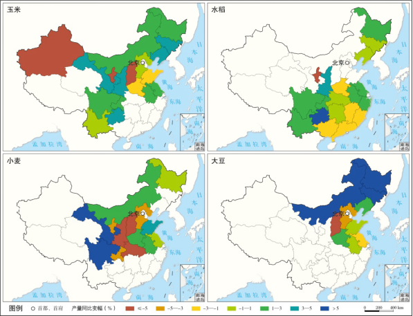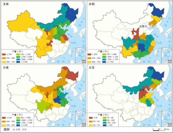 2019年中国夏粮(主要包括粮食作物冬小麦和油料作物油菜)总产量为12,804.4万t,与2017—2018年度相比,增产181.5万t,增幅为1.4%。2019年秋粮(包括玉米、中稻/一季稻、晚稻、春小麦、大豆、块茎类作物和其他小宗秋粮作物)产量为46,677.6万t,比2018年增长2.4%,主要是由于玉米和水稻产量同比增加。