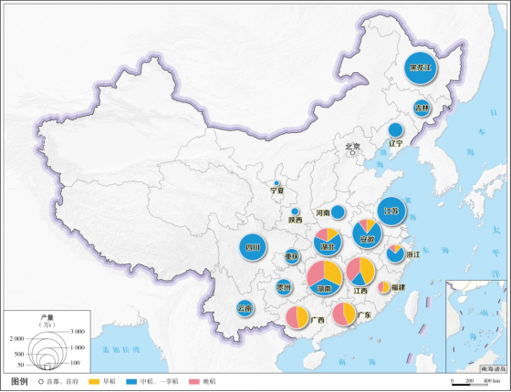 2019年水稻总产量为20,308.4万t,同比增产2.9%(图3-3)。全国水稻种植面积3,247万ha,同比略增30千ha,增幅为0.1%。早稻受种植面积缩减和持续阴雨寡照天气影响,产量同比下降80.9万t,减幅为2.4%,广东、广西、福建和江西早稻产量减幅均超过4%。中稻/一季稻和晚稻产量的增加促成了全国水稻的丰产,其中中稻/一季稻产量为13,319.0万t,同比增产3.4%,增产约439.2万t,主要得益于生长高峰期至成熟期良好的农业气象条件,中稻/一季稻单产同比增加2.8%。由于单产和种植面积的同步增加,晚稻产量增加了6.3%,达到3,665.7万t。