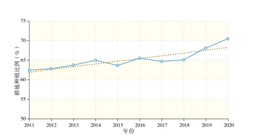 2019—2020年,地中海地区12个国家的耕地种植比例差异显著,葡萄牙、法国、意大利和希腊等发达国家耕地种植比例达到98%,西班牙的耕地种植比例也达到89%;阿尔及利亚、埃及、摩洛哥、叙利亚和突尼斯等国的耕地种植比例位列第二梯队,多处于60%~80%之间;利比亚和突尼斯两个国家的耕地种植比例最低,均低于50%,反映出两国耕地利用强度较低。
