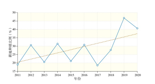 2011—2019年,包括埃及、西班牙、法国等在内的9个国家的耕地种植比例呈增加趋势,反映出地中海地区通过提升耕地利用强度以保障粮食安全、增加粮食产出的努力;其中,埃及、法国和利比亚三个国家的耕地种植比例增长趋势达到显著性水平(图6-3)。埃及的耕地种植比例几乎呈现线性增长的趋势,年均增长率约为0.7%;法国的耕地种植比例高于99%,且仍呈现缓慢增加趋势,表明该国耕地几乎全部得到有效利用;利比亚耕地种植比例虽然总体呈现显著增加趋势,但2011—2017年间年际波动巨大,呈现明显的增长-下降反复的变化特征,自2017年以后该国耕地种植比例的增长趋势强劲,耕地种植比例在3年内实现翻番,从不足20%快速增长到2019年的47%,这可能与该国民族团结政府的成立及农业发展政策的出台密切相关。阿尔及利亚、希腊和摩洛哥三个国家自2011年以来耕地利用强度均呈现波动下降趋势,但均未达到显著性水平。